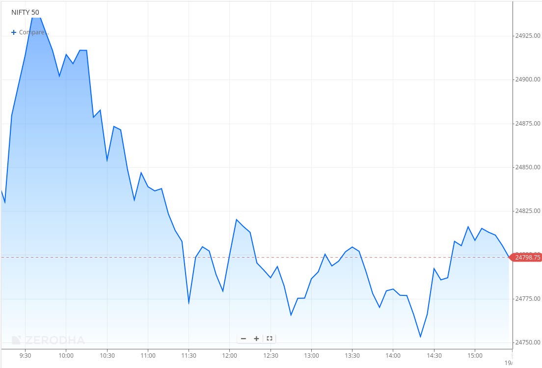 Nifty opened with a 65-point gap-down at 24,788.35 but quickly rebounded, rising by 160 points within the first 30 minutes. The index then consolidated in a narrow range between 24,900 and 24,940 before sliding 170 points by 11:30 AM. For the rest of the session, Nifty traded in a tight range between 24,750 and 24,825, eventually closing at 24,812.05, down 0.16%.