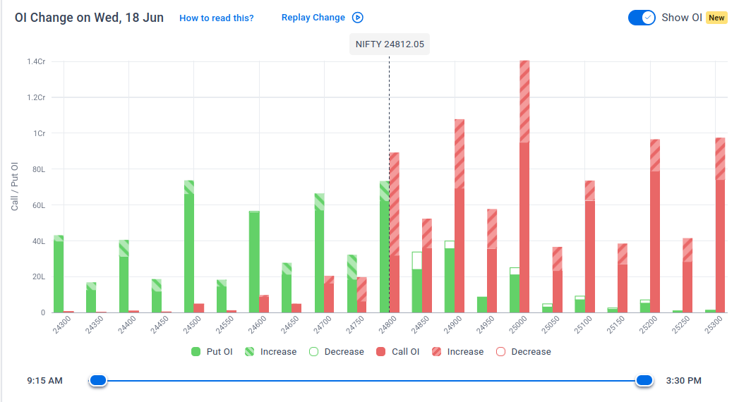 The maximum Put Open Interest (OI) is observed at 24,500, followed closely by 24,800, suggesting strong support at 24,600 to 24,500 levels.