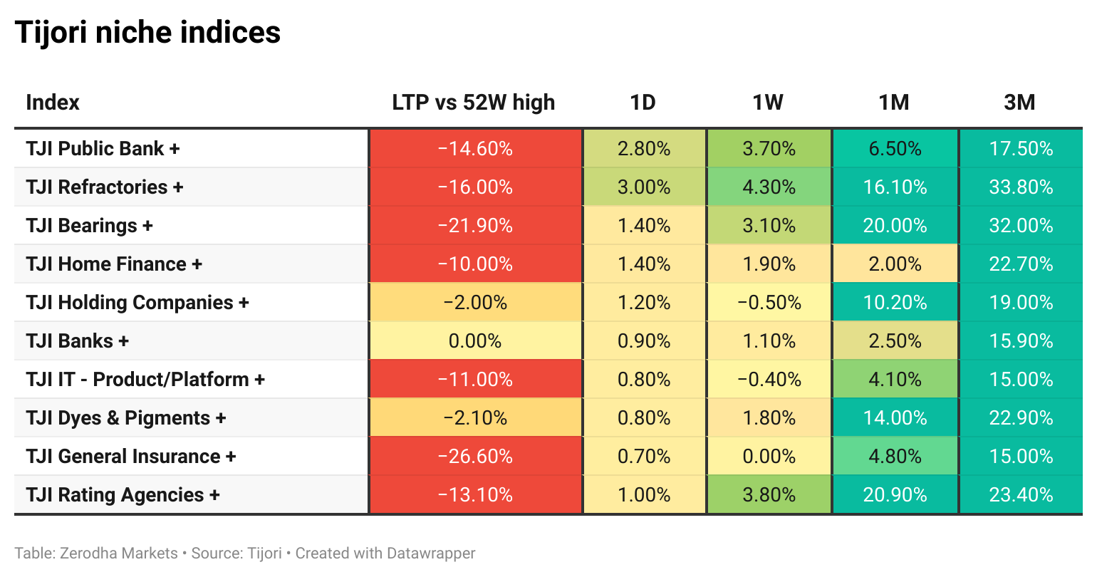 Tijori is an investment research platform, and they have constructed niche indices for various themes and sub-sectors. They help you understand the market performance of narrow slices of the market. You can also track the Promoter buying and other interesting stuff like Capex activity by the companies in the Tijori App’s idea dashboard