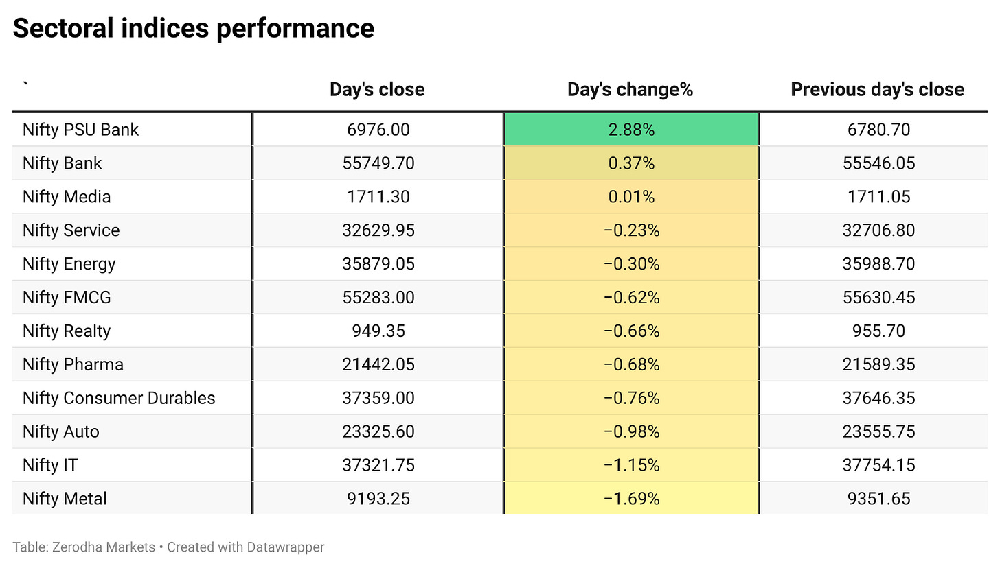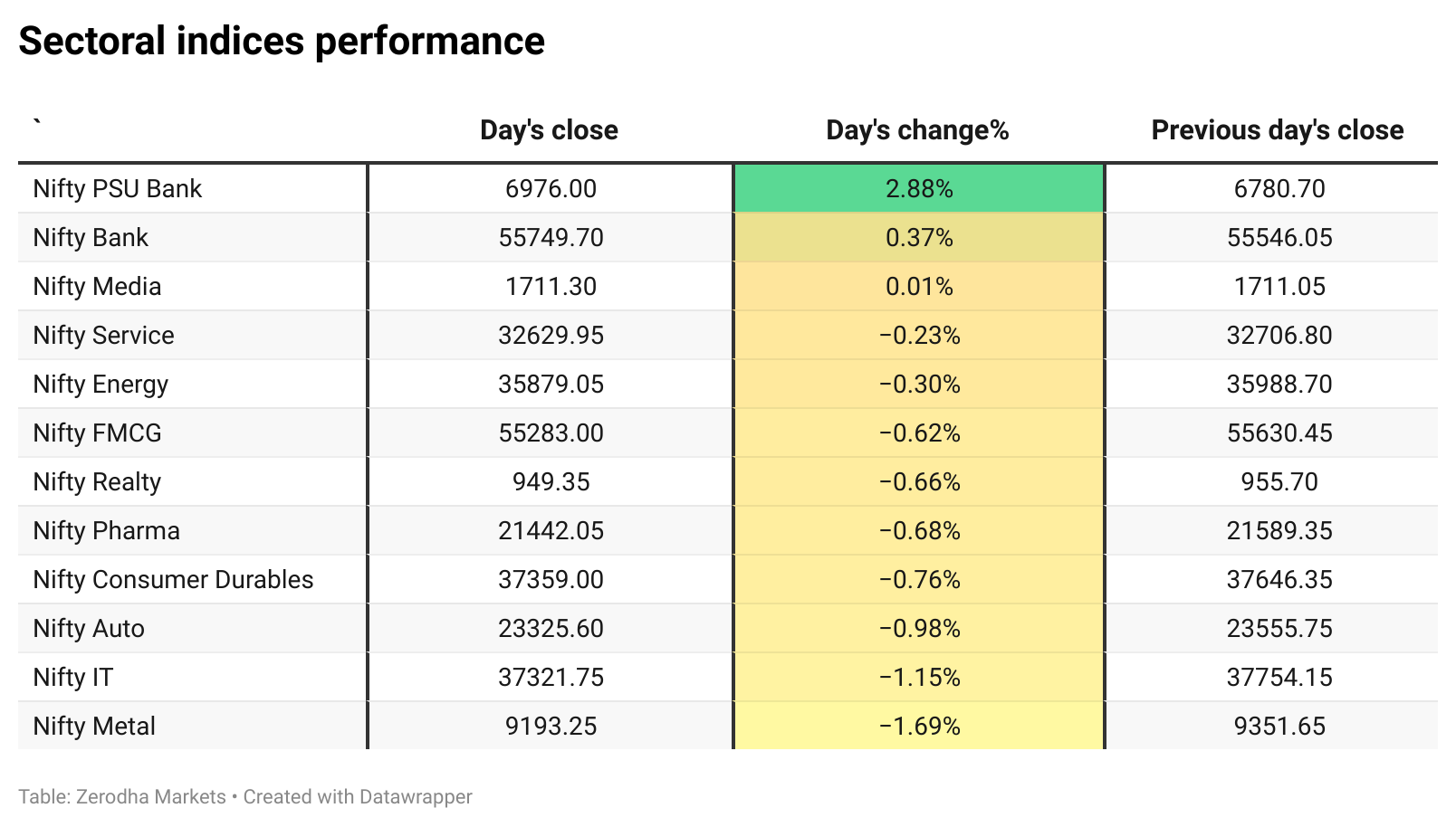 Out of the 12 sectoral indices listed, 3 sectors closed in the green (PSU Bank, Bank, Media), while 9 sectors ended in the red, indicating a largely negative trend across the broader market.