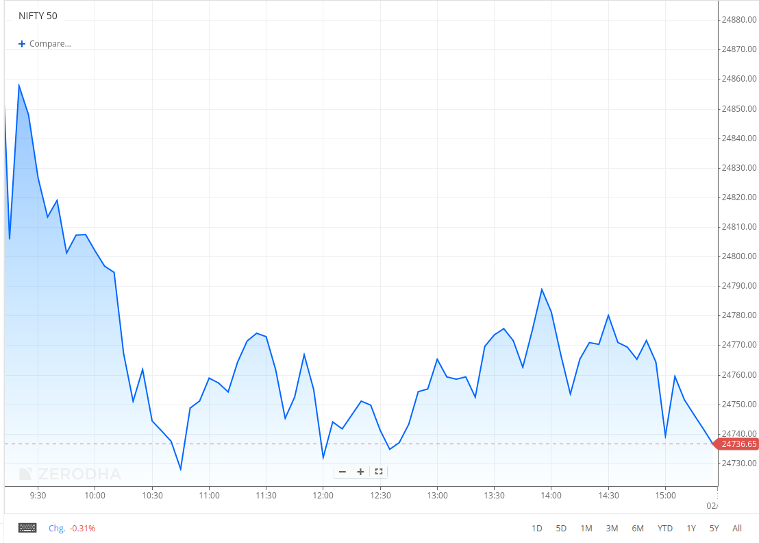 Nifty opened with a 20-point gap down at 24,812.60 and attempted to cross the 24,860 mark in the first 30 minutes. However, an intraday sell-off dragged the index down to 24,720 by 11 AM. For the remainder of the session, the market stayed rangebound within a 60-point band between 24,730 and 24,790, eventually closing at 24,750.70, down by 0.33%.