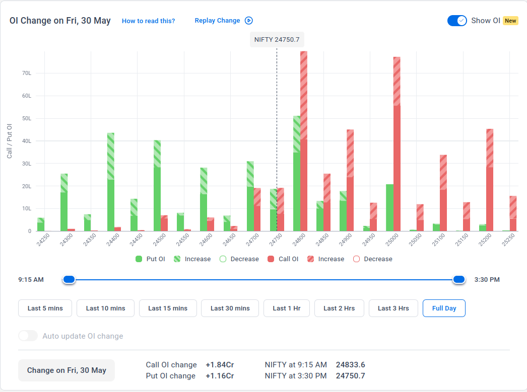 The maximum Call Open Interest (OI) is observed at 24,800, followed closely by 25,000, suggesting strong resistance at 25,000 - 25,100 levels.