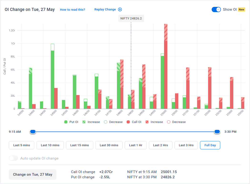 The maximum Put Open Interest (OI) is observed at 24,500, followed closely by 25,000, suggesting strong support at 24,700 to 24,600 levels.