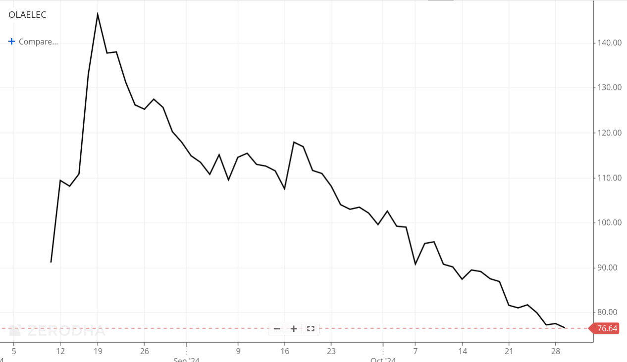 Ola Electric's stock dropped below its IPO price of ₹ 76) for the first time, hitting an all-time low of ₹74.84. Stock is down nearly 50% from its all-time high of ₹157.40