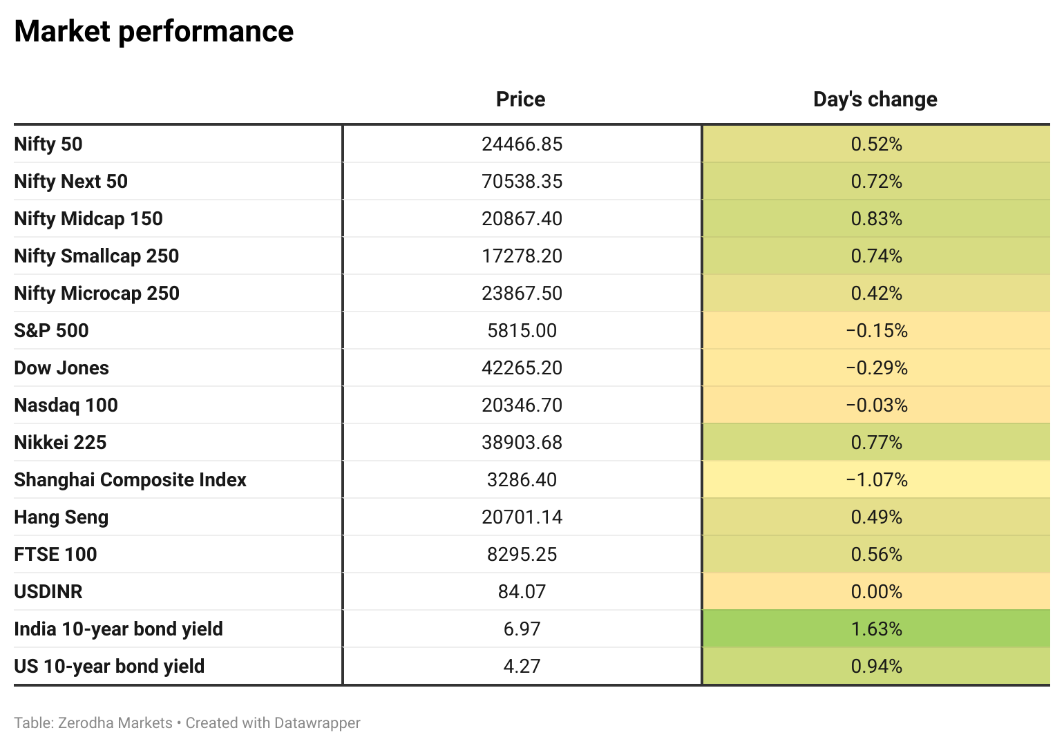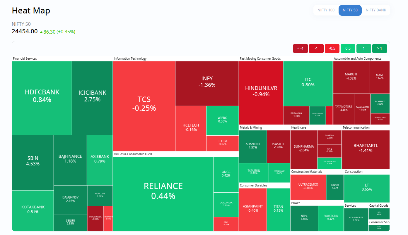 Indian equity indices rebounded strongly in the latter half of the trading session on October 29, marking a second consecutive day of gains. The Nifty closed above 24,450, supported by a positive advance-decline ratio of 1.63, signaling broad-based buying interest across sectors.
