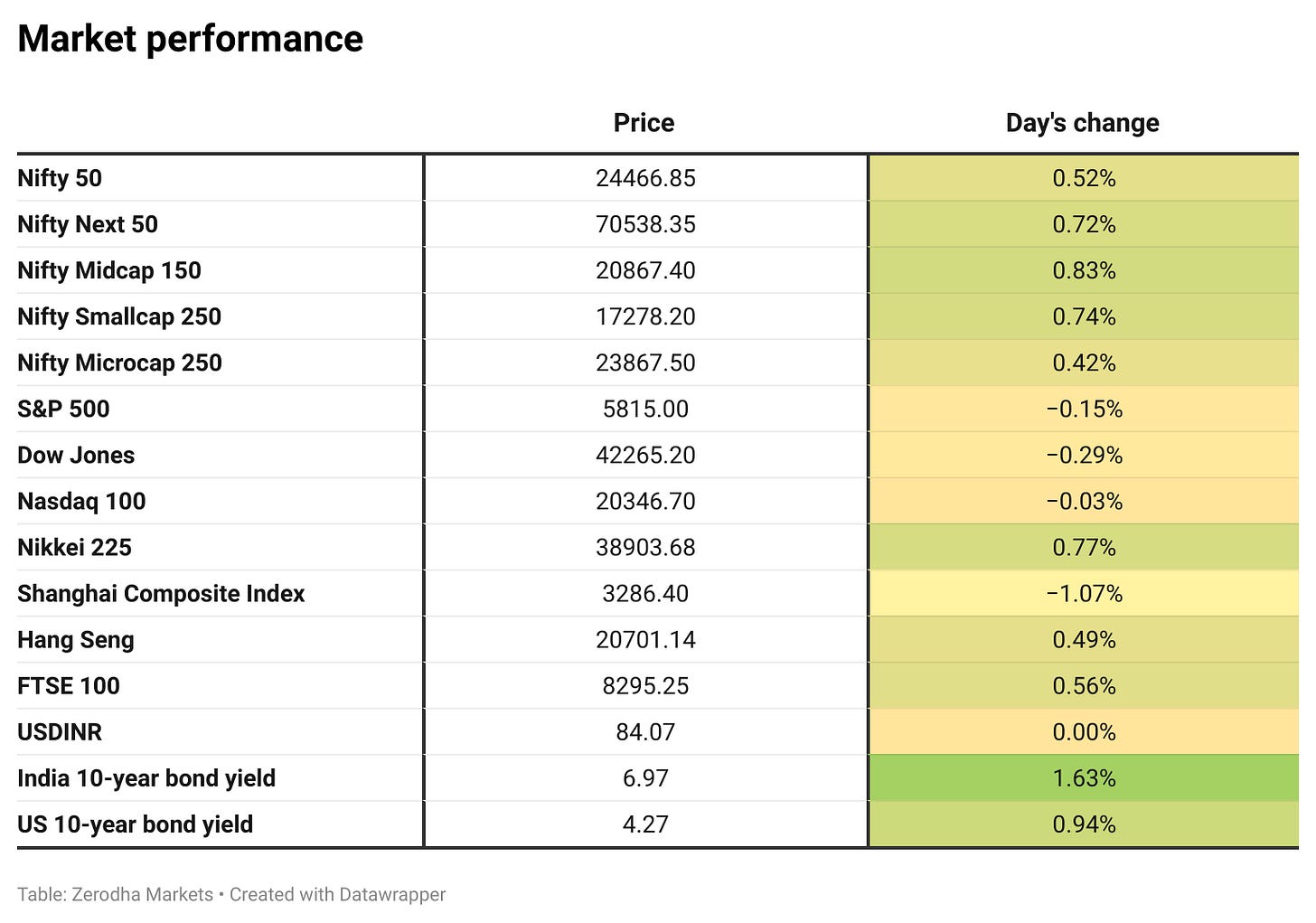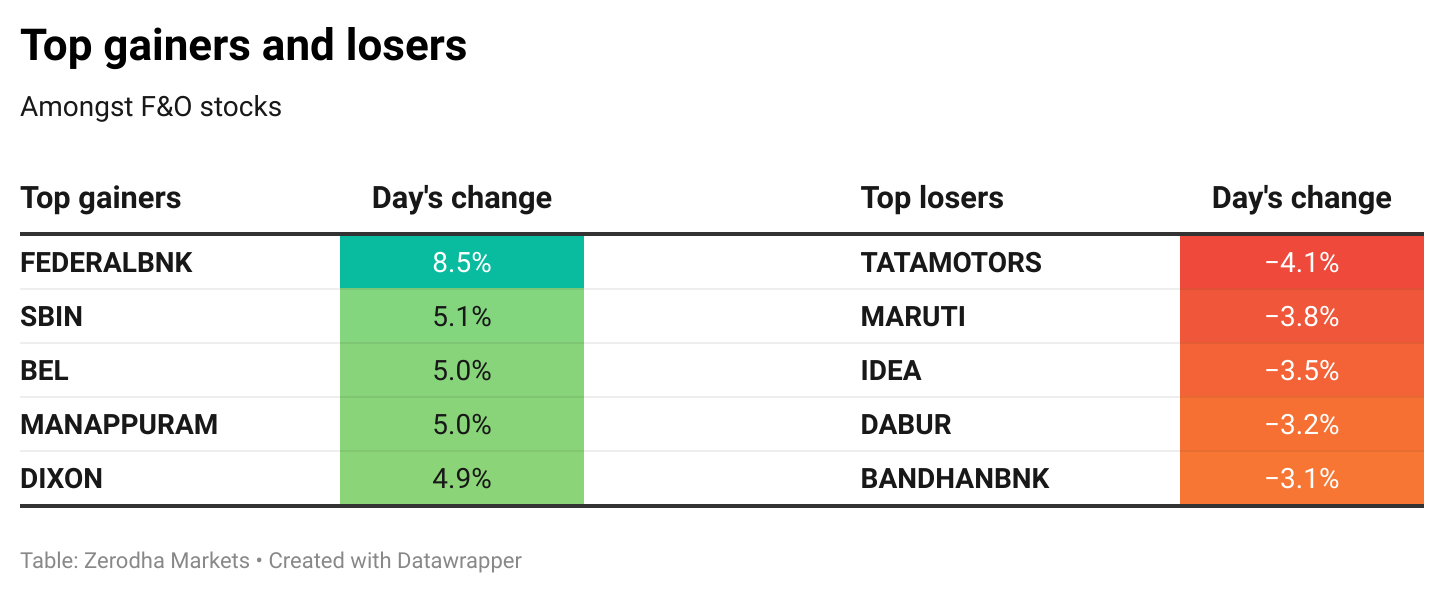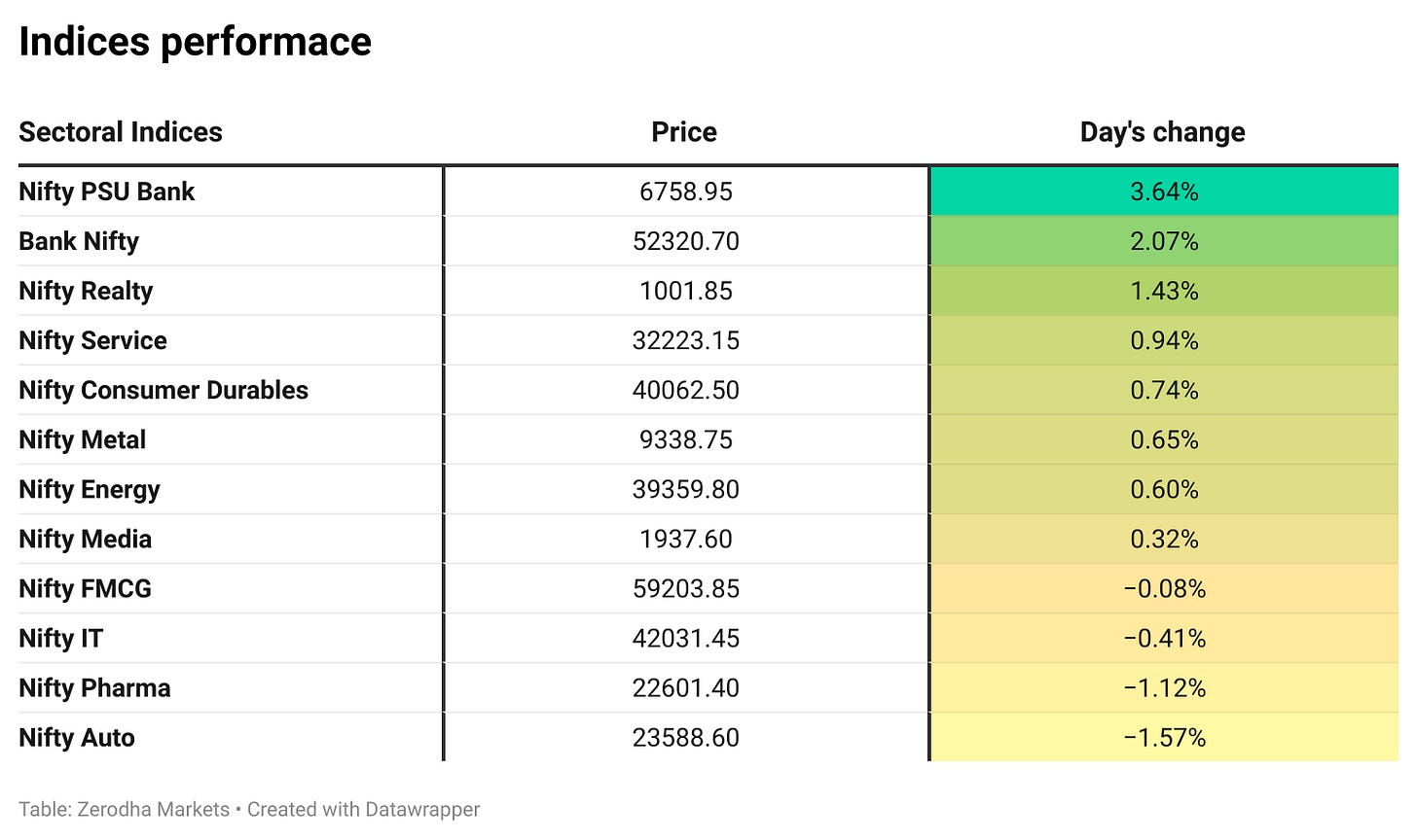 PSU banks led the sectoral indices in gains, driven by strong earnings from Canara Bank. Meanwhile, the auto sector continued its downward trend due to weaker results and a cautious outlook for future performance.
