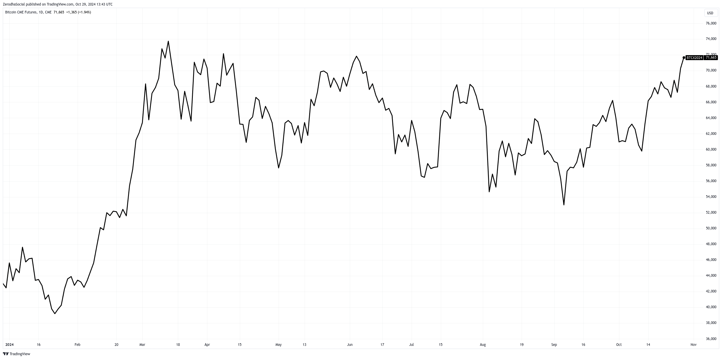 Bitcoin surpassed $71,000 for the first time since June, driven by strong inflows into exchange-traded funds (ETFs) and speculation surrounding the upcoming U.S. election.