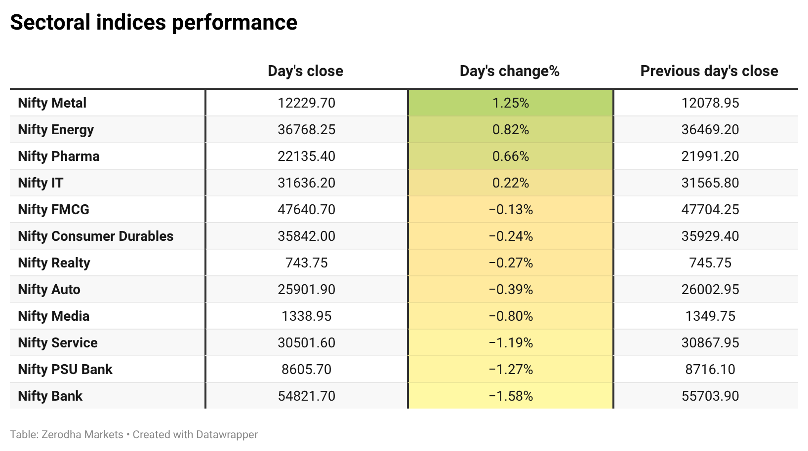 Nifty Metal was the top gainer, rising 1.25%, while Nifty Bank was the top loser, down 1.58%. Overall, 4 sectors closed in green, and 8 sectors ended in red.