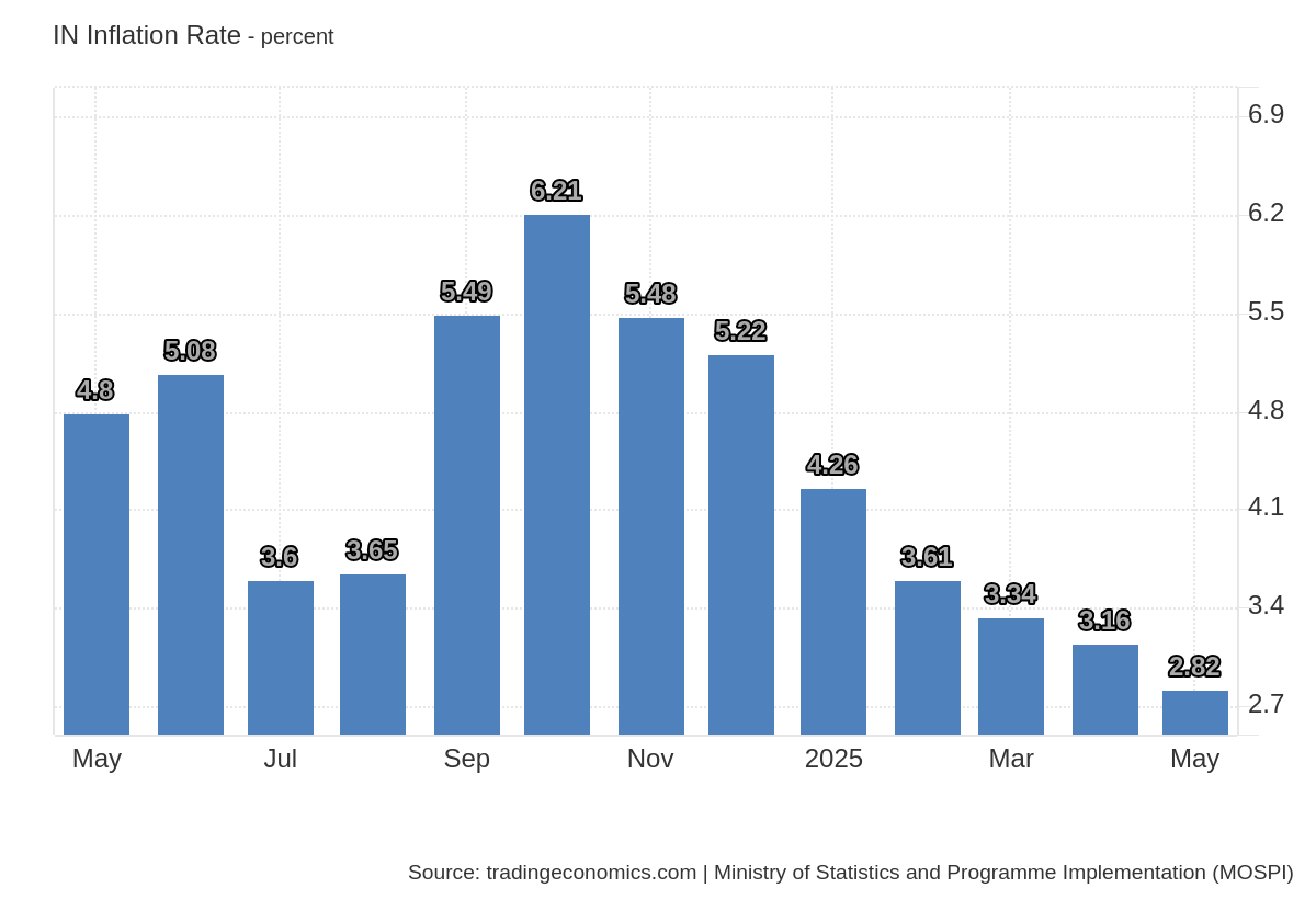 India’s consumer inflation eased to 2.82% in May 2025, its lowest since February 2019 and below expectations, driven by a sharp fall in food prices. Inflation in housing, health, and transport categories remained steady or edged higher. Dive deeper