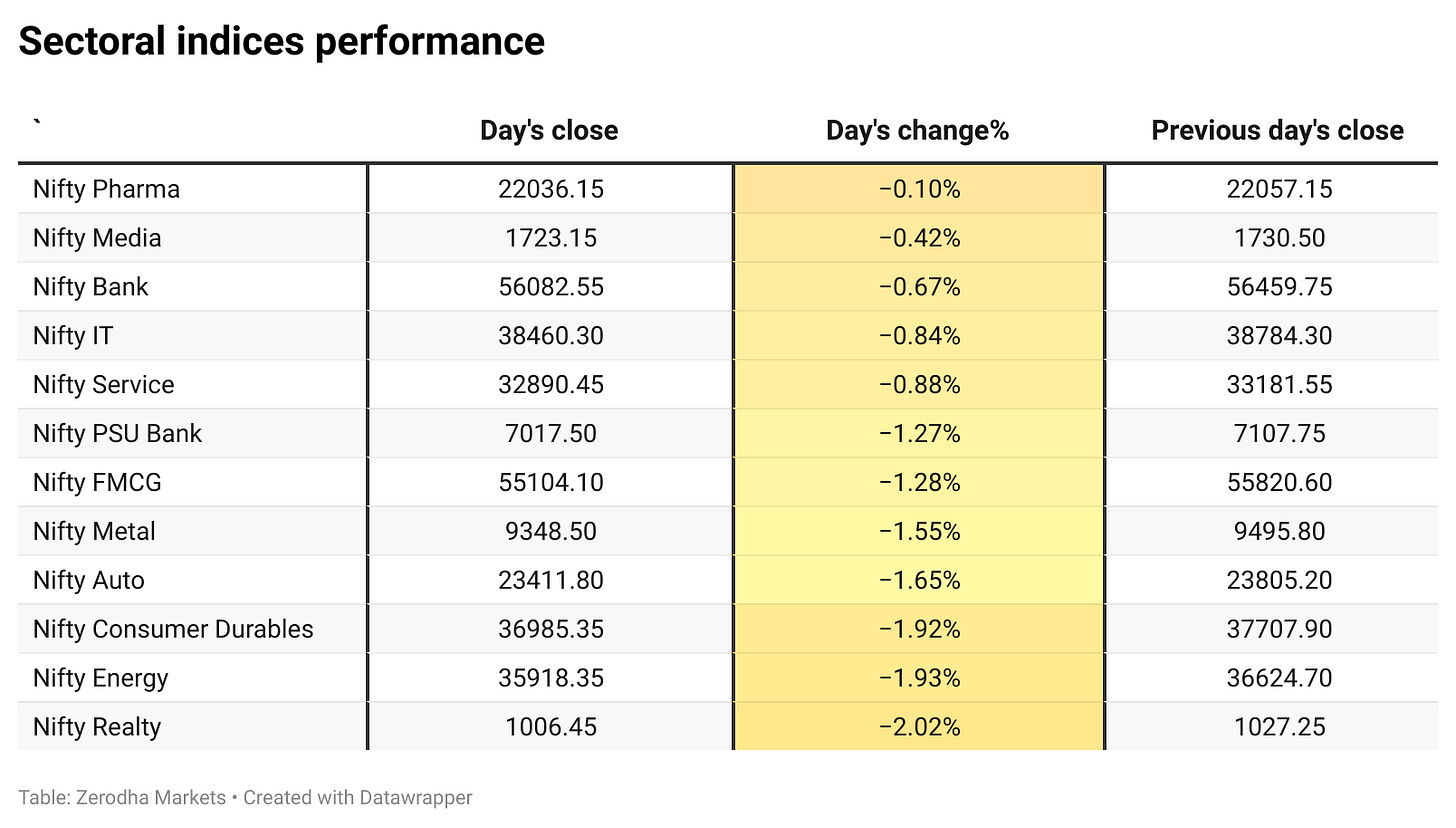All 12 sectoral indices ended in the red, marking a broad-based sell-off across the market.