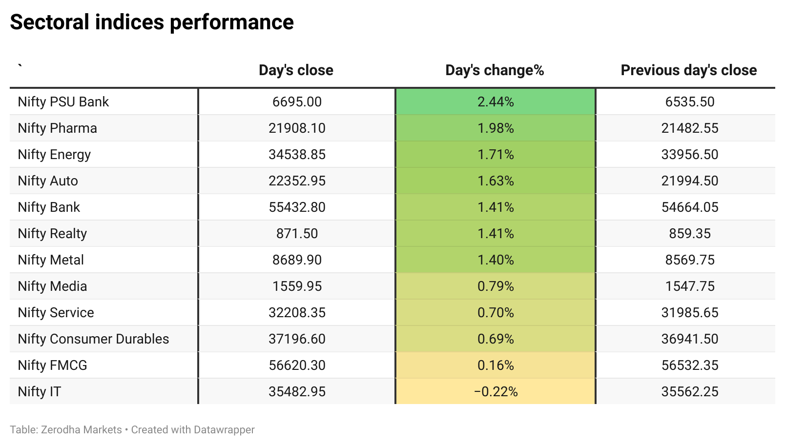 The top-gaining sector for the day was Nifty PSU Bank, which rose by 2.44%, while the only losing sector was Nifty IT, which declined by 0.22%. Out of the 12 sectors listed, 11 sectors closed in the green and 1 sector closed in the red.