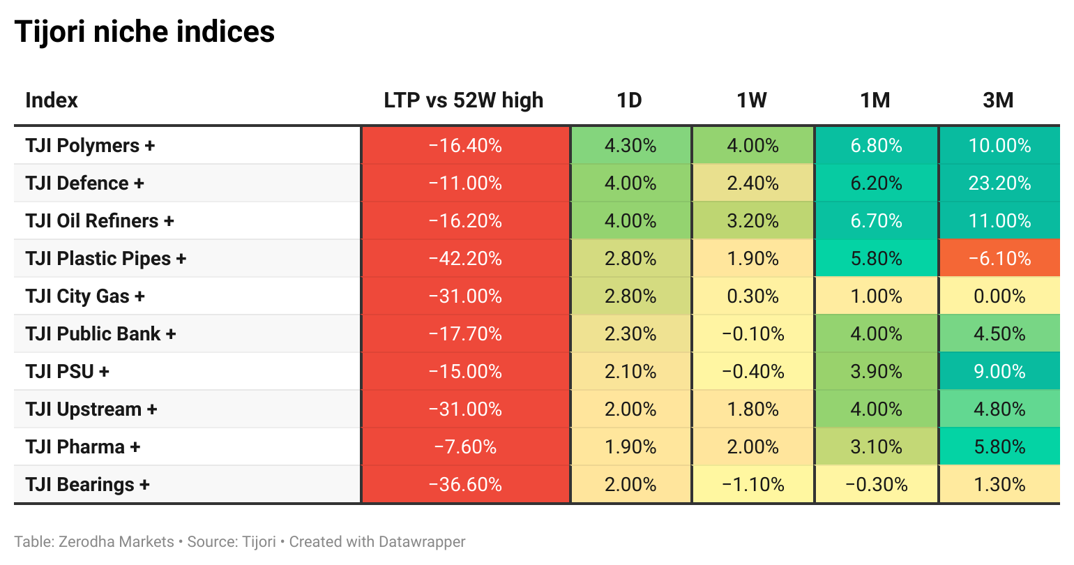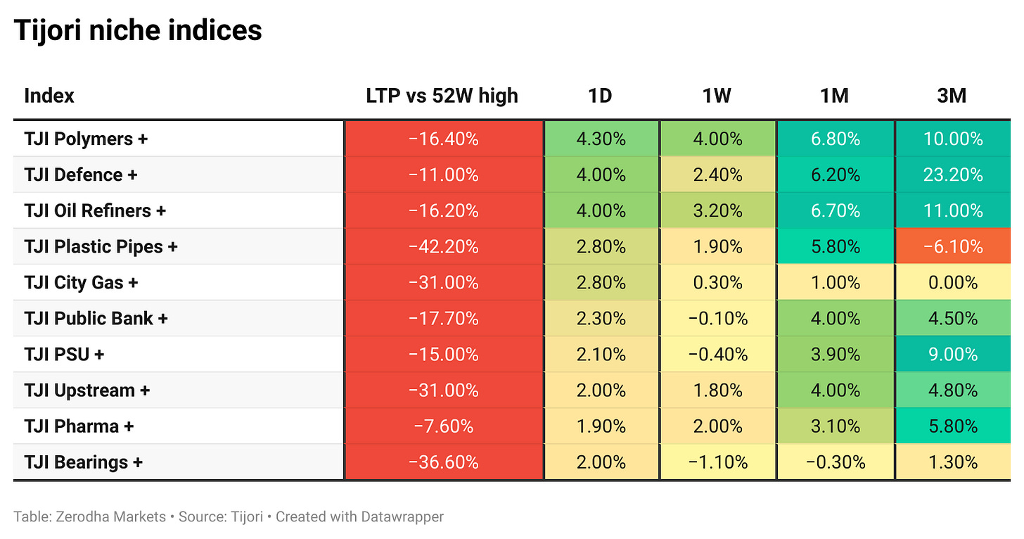 Tijori is an investment research platform, and they have constructed niche indices for various themes and sub-sectors. They help you understand the market performance of narrow slices of the market. You can also track the Promoter buying and other interesting stuff like Capex activity by the companies in the Tijori App’s idea dashboard