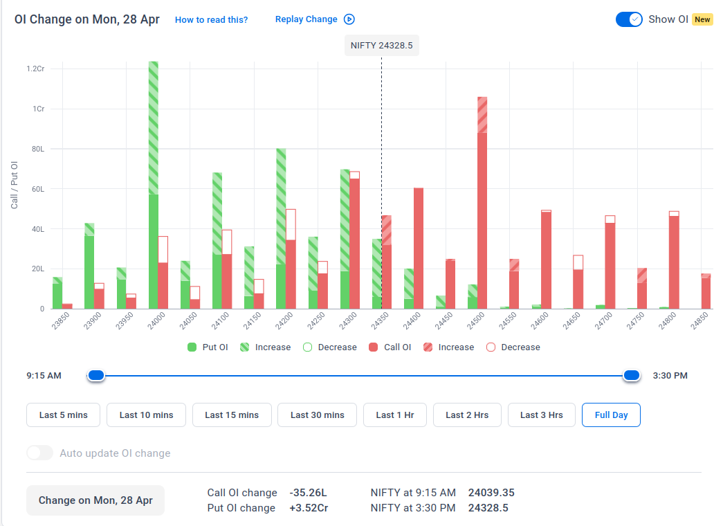 The maximum Put Open Interest (OI) is 24,000, followed by 24,200, suggesting strong support at 24,000 and additional support at 23,800.