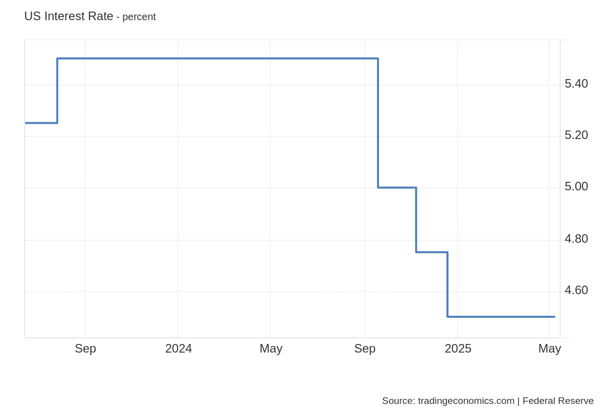 The Federal Reserve kept the funds rate at 4.25%–4.50% in May 2025, maintaining a wait-and-see approach amid concerns over tariffs, inflation, and economic growth while emphasizing solid economic expansion. Dive deeper