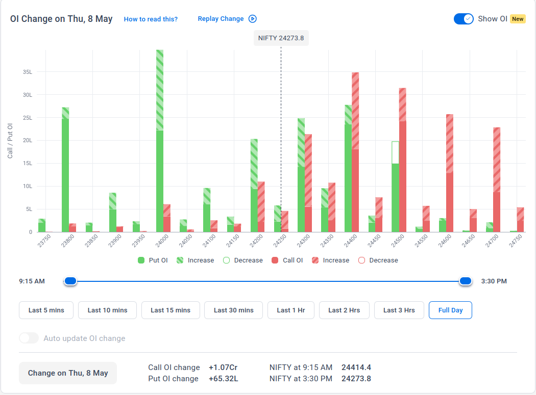 Excellent summary! There seems to be an error in the following line. "The maximum Put Open Interest (OI) is 24,000, followed by 24,400, suggesting strong support at 24,000 and additional support at 23,800." I think 24,400 in the middle of the sentence should be replaced by 23,800. Otherwise, the summary is so comprehensive and informative.