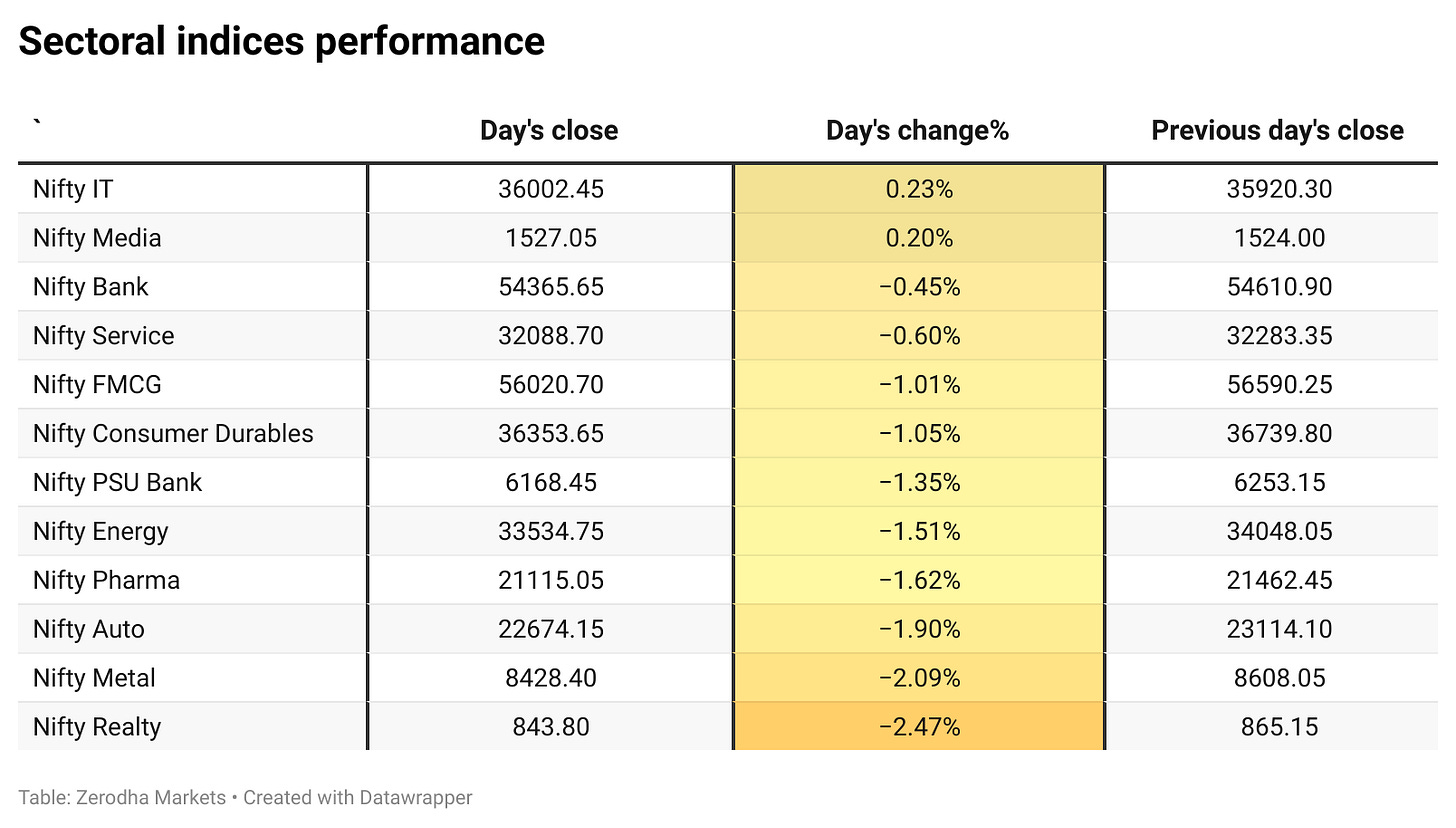 Nifty IT emerged as the top gainer, closing 0.23% higher, while Nifty Realty was the biggest loser, falling 2.47%. Out of the 12 major sectors, only Nifty IT and Nifty Media closed in the green, while the remaining 10 sectors ended in the red, reflecting a broadly negative market sentiment.