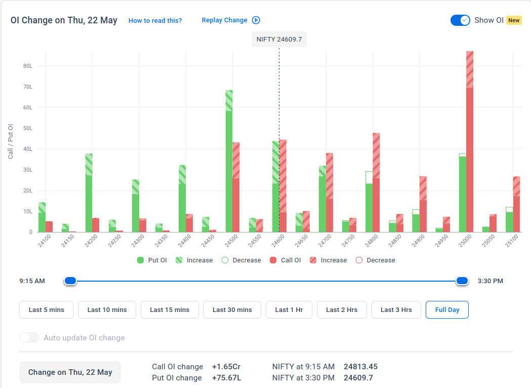 The maximum Call Open Interest (OI) is observed at 25,000, followed closely by 24,800, suggesting strong resistance at these levels.