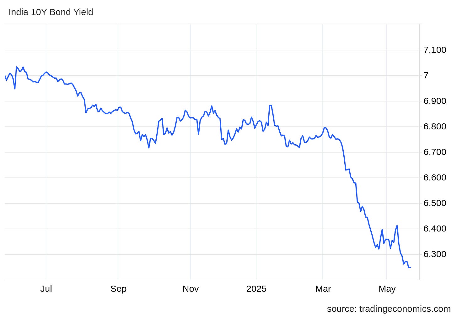 The 10-year Indian G-Sec yield fell below 6.25% in May, driven by India's ceasefire with Pakistan, a series of RBI repo rate cuts, and favorable inflation data. This helped stabilize markets and boosted foreign inflows into Indian bonds. Dive deeper