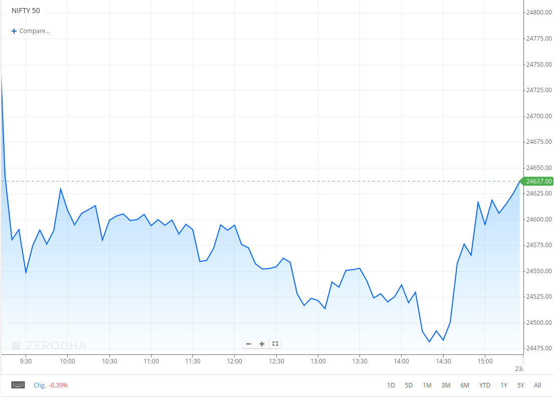 Nifty opened with an 80-point gap down at 24,733.95, following a weak close in U.S. markets. Selling pressure intensified after the open, with the index sliding to 24,550 in the first hour. It then consolidated between 24,550 and 24,625 until 1 PM, before making fresh intraday lows around 24,462. In the final hour, Nifty staged a strong 200-point recovery and eventually closed at 24,609.70, down 0.82%.