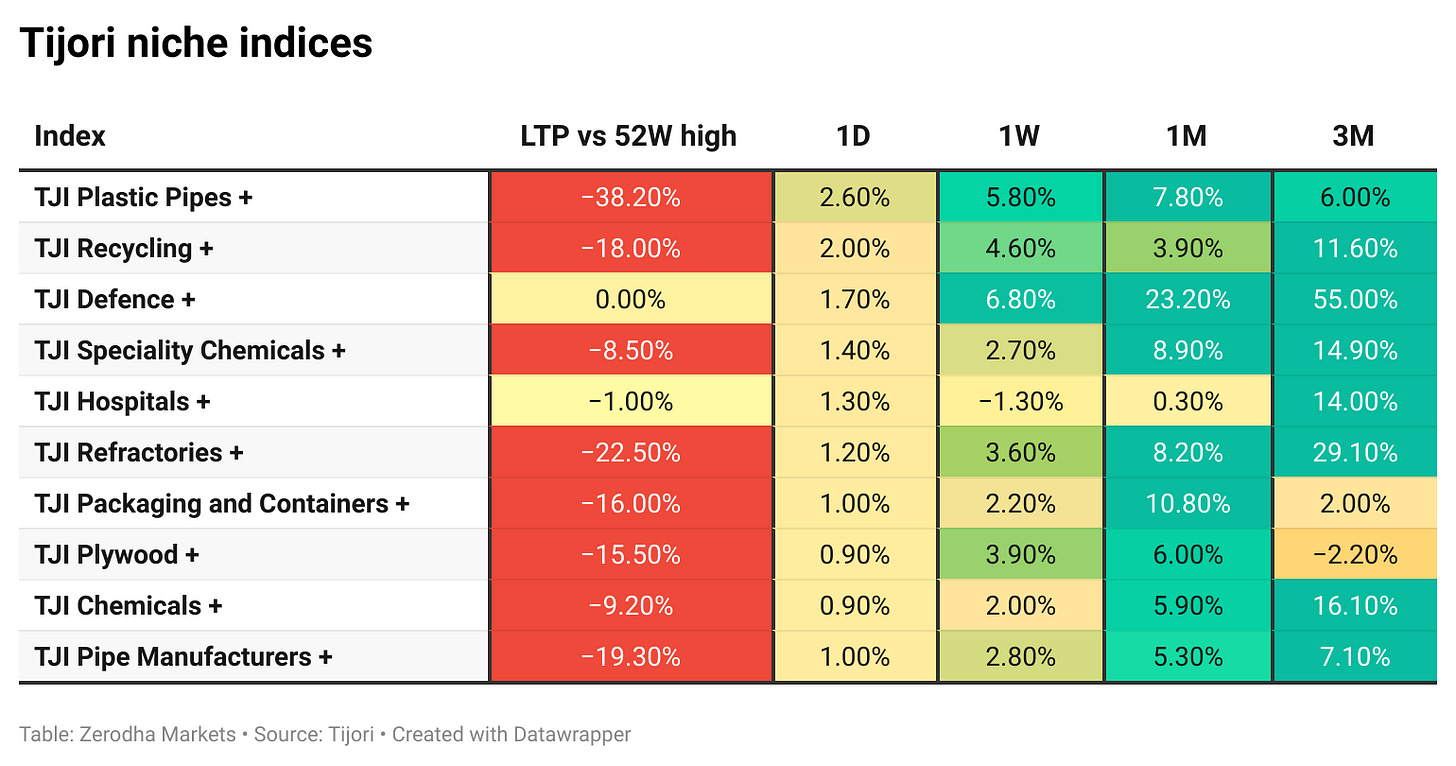 Tijori is an investment research platform, and they have constructed niche indices for various themes and sub-sectors. They help you understand the market performance of narrow slices of the market. You can also track the Promoter buying and other interesting stuff like Capex activity by the companies in the Tijori App’s idea dashboard