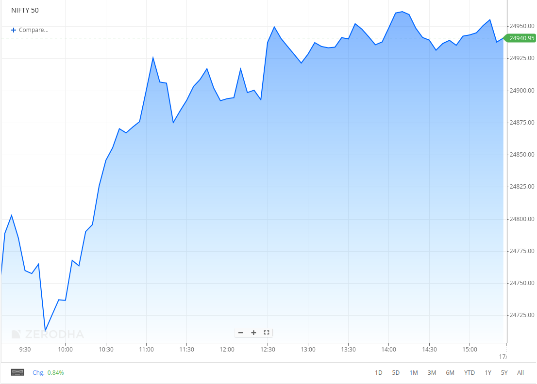 Nifty started flat at 24,723.35 despite rising geopolitical tensions, then climbed to 24,810 in the first 15 minutes. After an early sell-off wiped out gains, a sharp 220-point rally pushed it to 24,920, where it traded in a tight range and closed up 0.92% at 24,946.50.