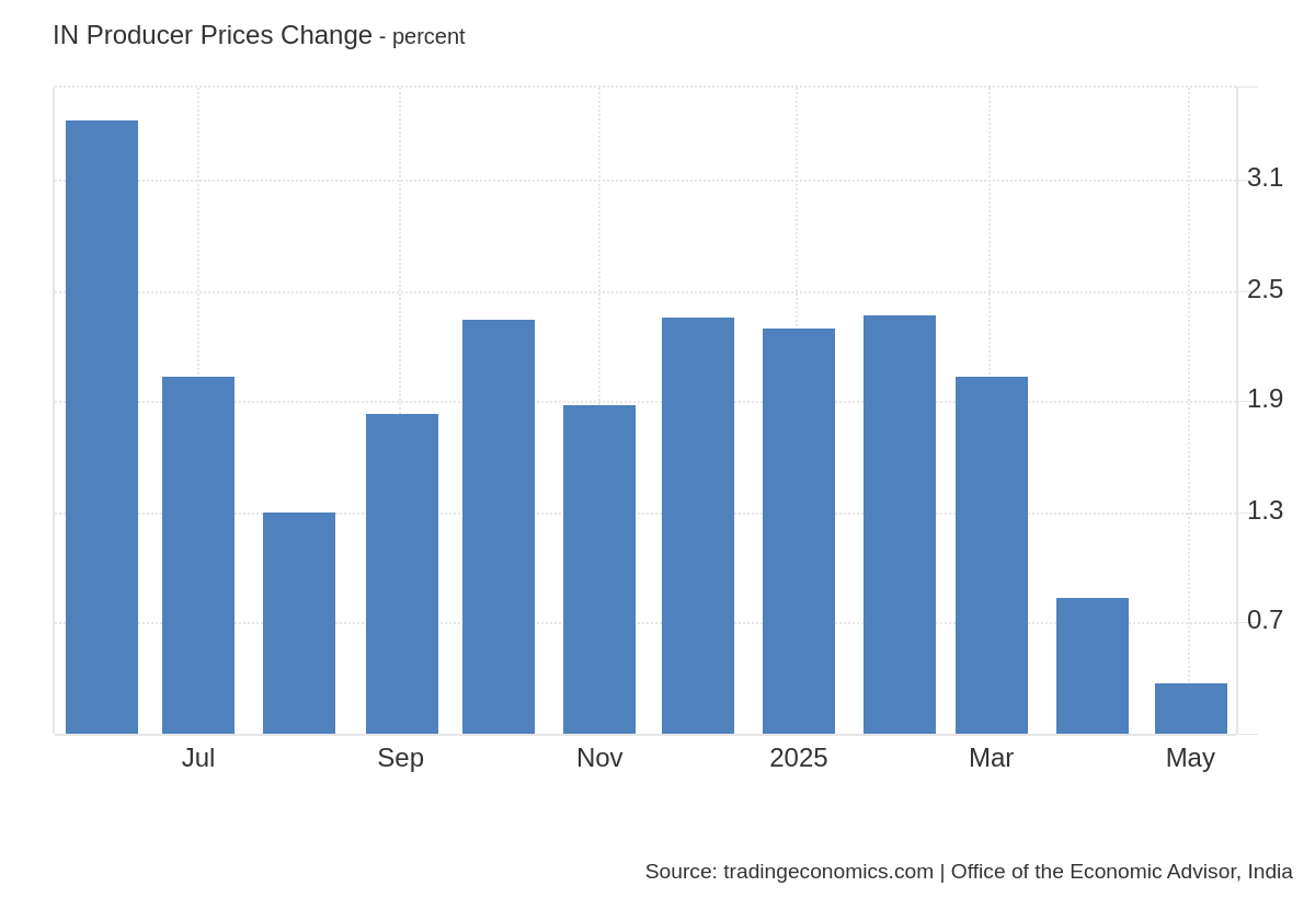 India’s wholesale price inflation eased to 0.39% in May 2025, the lowest since March 2024, driven by a sharp fall in vegetable prices and slower manufacturing inflation. Fuel and power costs continued to decline, while primary article prices also dropped. Wholesale prices fell 0.06% month-on-month. Dive deeper