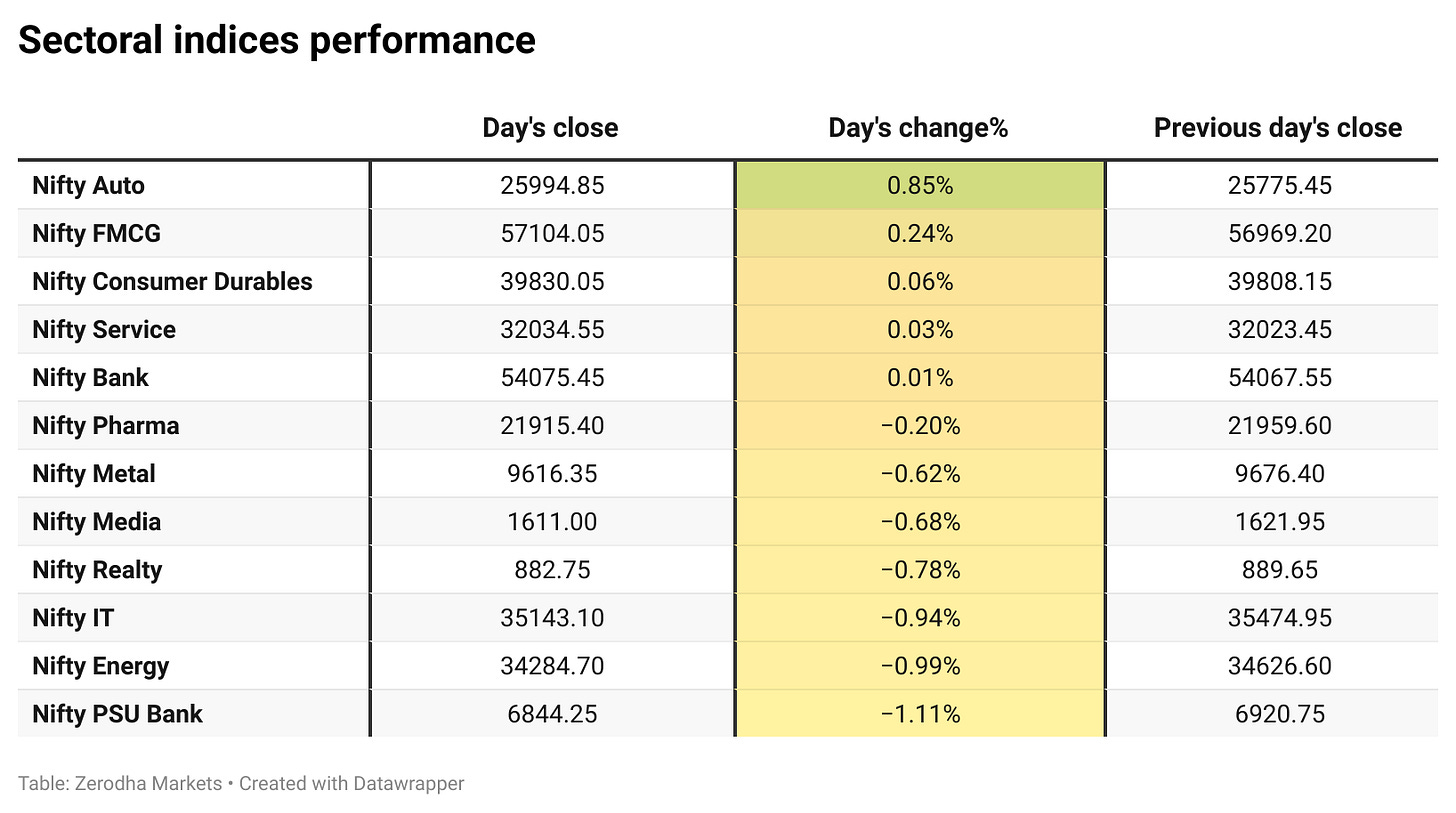 Nifty Auto was the top gainer, rising 0.85%, while Nifty PSU Bank led the losses with a sharp 1.11% decline. Out of 12 sectoral indices, 4 closed in the green and 8 ended in the red, indicating broad-based weakness despite selective strength in autos and FMCG.