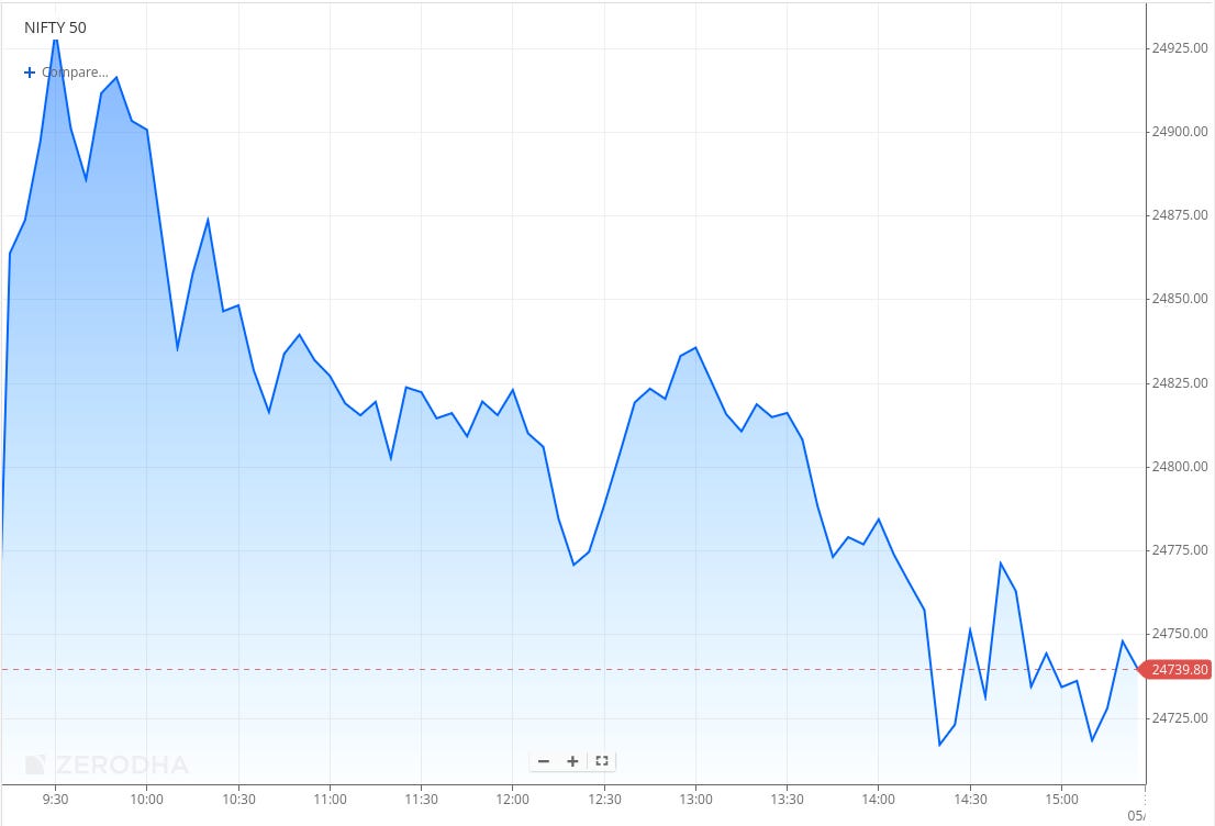 In the second half, weakness intensified as Nifty turned negative post 2 PM. Despite a brief recovery attempt, the index eventually closed flat at 24,734.30, nearly 1% below its opening levels.