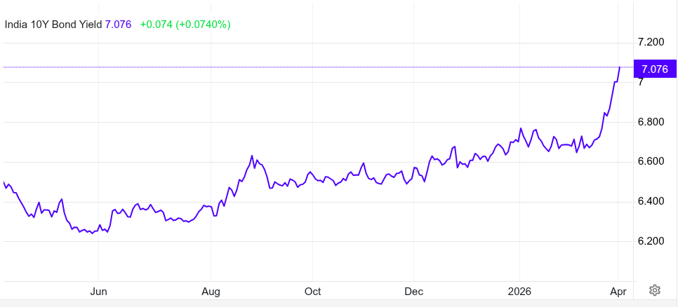 India’s 10-year G-Sec yield rose to 7.1%, the highest since May 2024, tracking the surge in crude prices. Inflation concerns have intensified, raising expectations of potential rate hikes by the Reserve Bank of India. Dive deeper