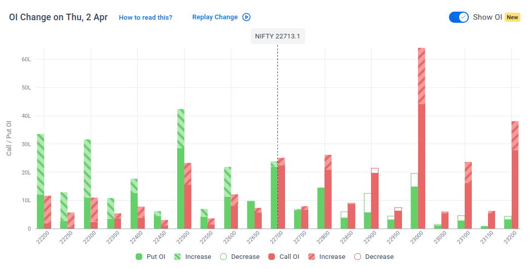The maximum Put Open Interest (OI) is observed at 22,500, followed by 22,200 & 22,300, suggesting support at 22,400-22,300.