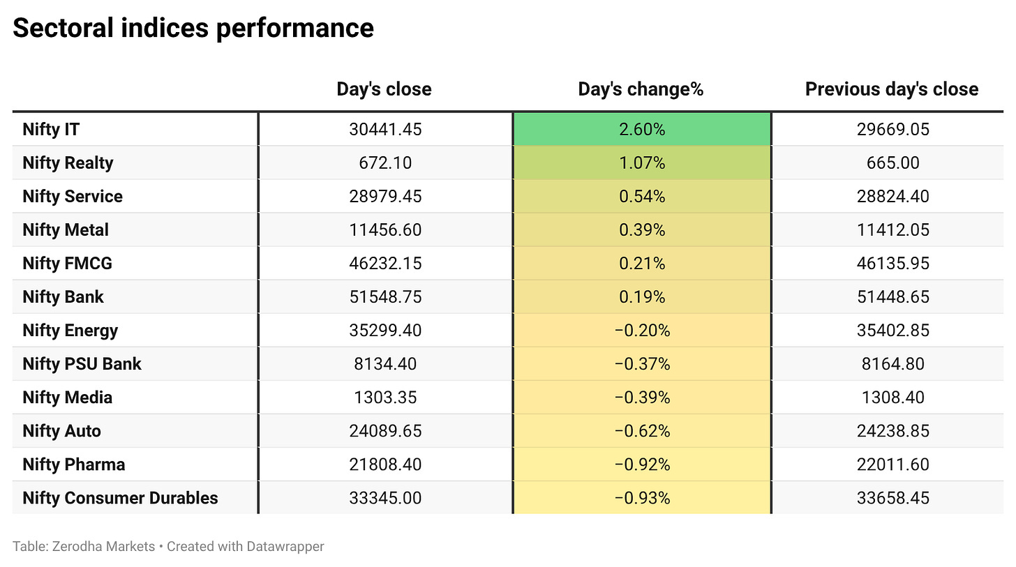 Nifty IT was the top gainer, rising 2.60%, while Nifty Consumer Durables was the top loser, down 0.93%. Overall, 6 sectors closed in green, and 6 sectors ended in red.