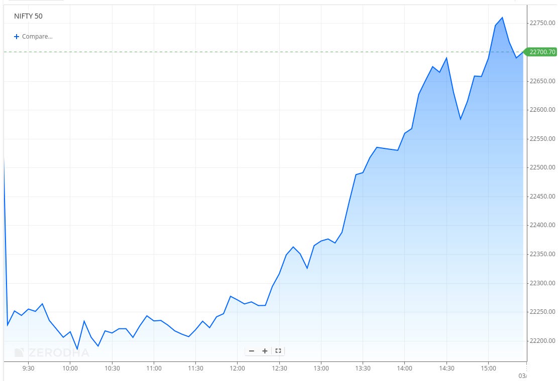 Despite a slight pullback from the highs, Nifty held on to most of its gains and eventually closed at 22,713.10, marking a strong recovery session after a weak start, driven by steady buying through the second half and a sharp late surge.