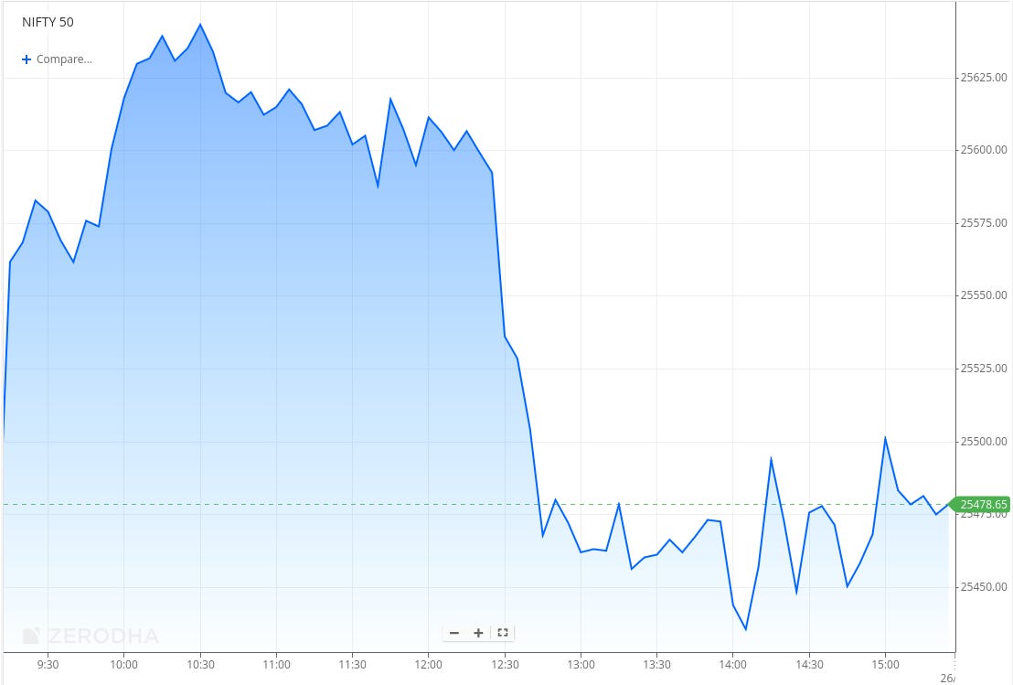 Nifty opened with an 88-point gap-up at 25,513, tracking strong global cues and early optimism. The index extended gains in the opening hour, climbing steadily toward the 25,600–25,640 zone as buying momentum remained firm. However, the early strength began to fade by late morning, with the index gradually paring gains and consolidating between 25,580 and 25,620.