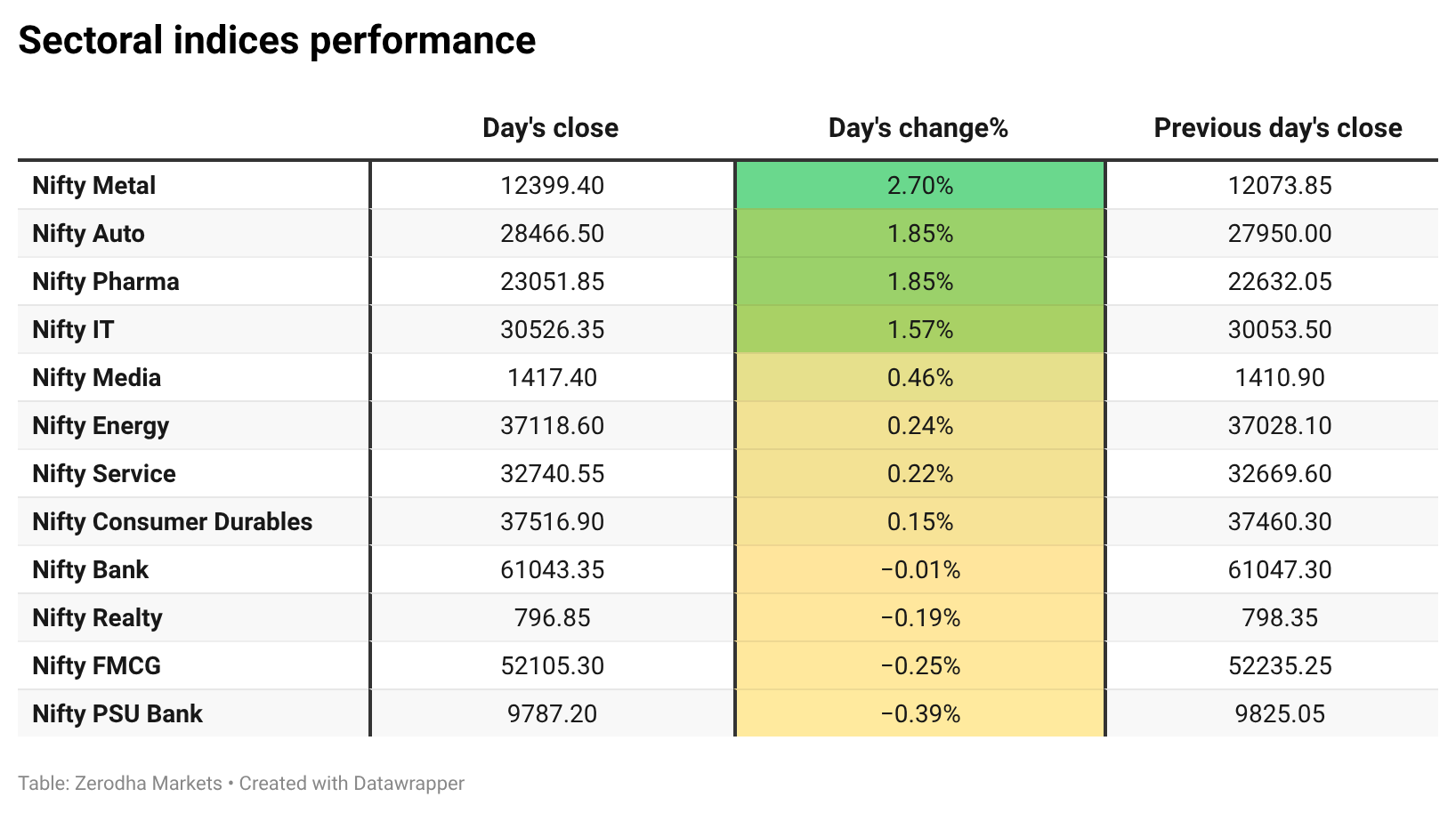 Nifty Metal was the top gainer, surging 2.70%, while Nifty PSU Bank was the top loser, slipping 0.39%. Overall, 8 sectors closed in green, and 4 sectors ended in red.