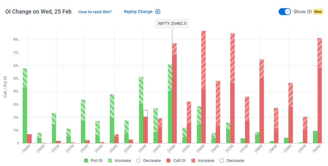 The maximum Put Open Interest (OI) is observed at 25,500, followed by 25,000, suggesting support at 25,300-25,200.