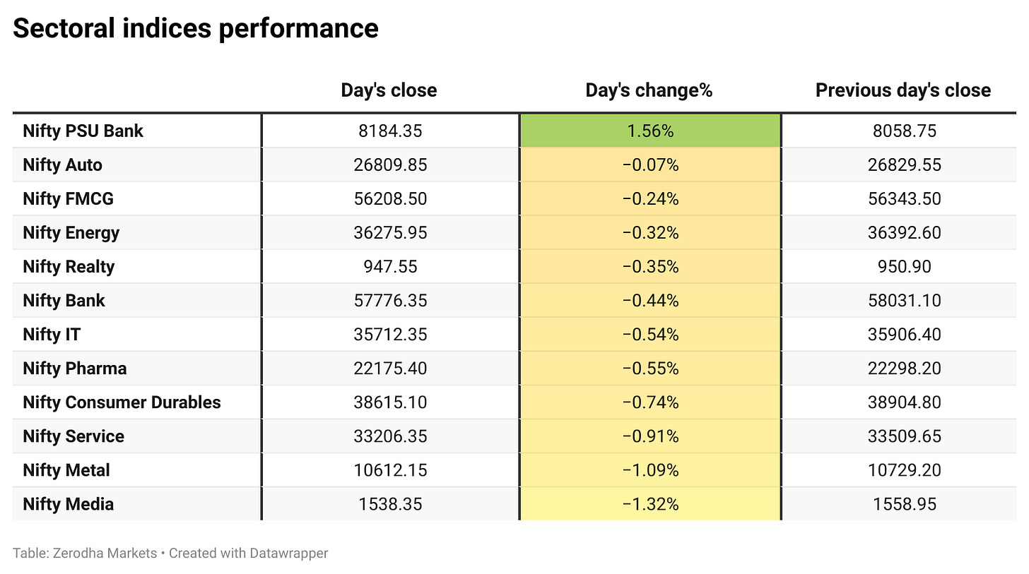 Nifty PSU Bank was the top gainer, rising 1.56%, while Nifty Media was the biggest loser, slipping 1.32%. Out of the 12 sectoral indices, only one closed in the green and 11 ended in the red, indicating broad-based weakness across the market.