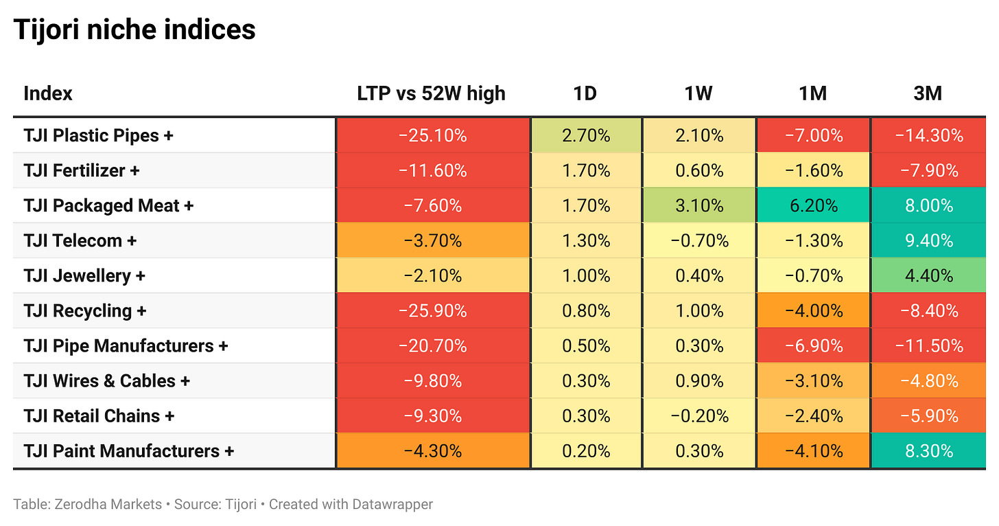 Tijori is an investment research platform, and they have constructed niche indices for various themes and sub-sectors. They help you understand the market performance of narrow slices of the market. You can also track the Promoter buying and other interesting stuff, like Capex activity by the companies in the Tijori App’s idea dashboard