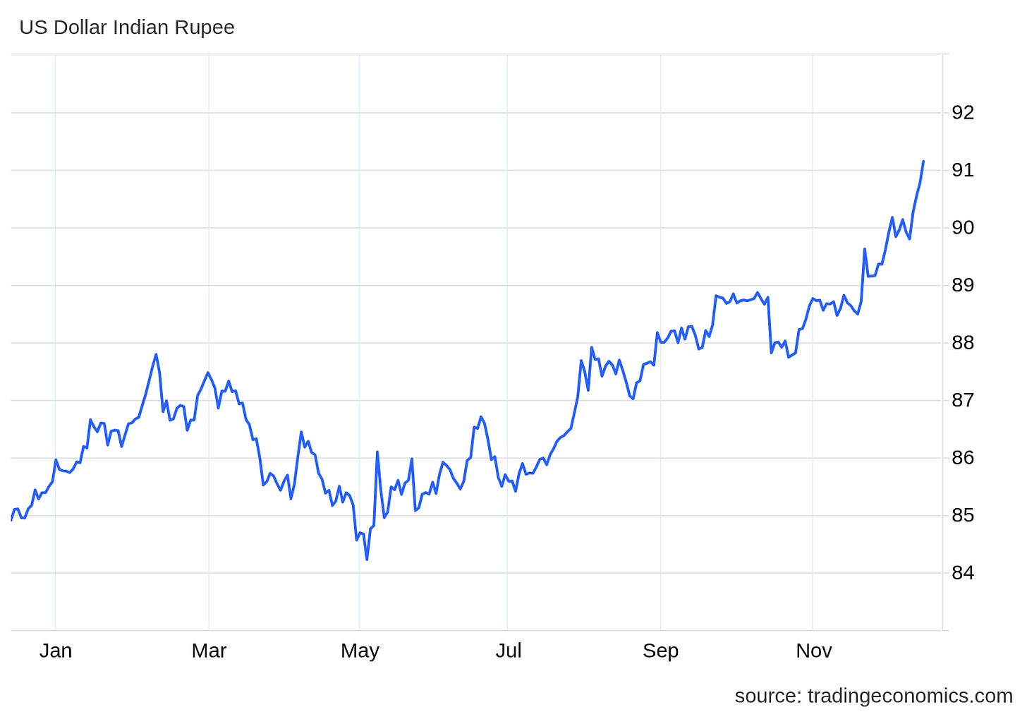 The rupee slipped past 91 per dollar for the fourth straight session as foreign money keeps moving out and US-India trade talks remain stuck. Heavy selling by overseas investors and pressure from US tariffs are weighing on sentiment. Dive deeper