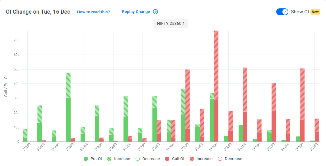 The maximum Put Open Interest (OI) is observed at 25,500, followed by 25,900, suggesting support at the 25,800 to 25,700 levels.