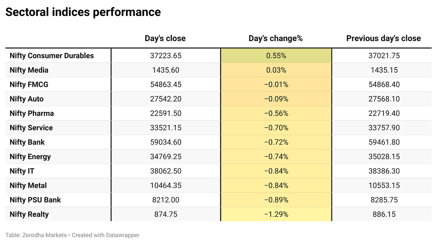 The top-gaining sector for the day was Nifty Consumer Durables, which rose by 0.55%, while the top losing sector was Nifty Realty, down 1.29%.