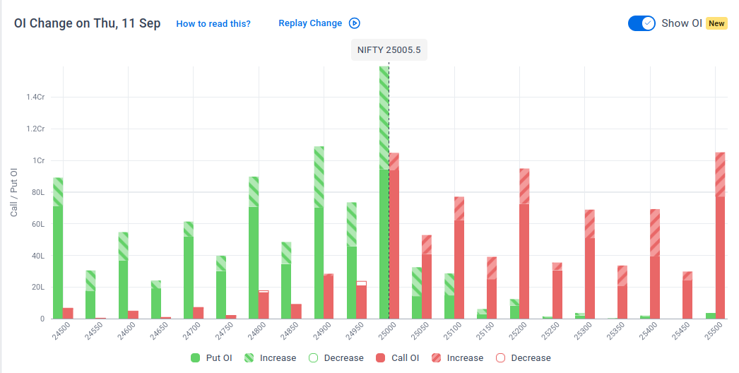 The maximum Put Open Interest (OI) is observed at 25,000, followed closely by 24,900, suggesting strong support at 24,900 to 24,800 levels.