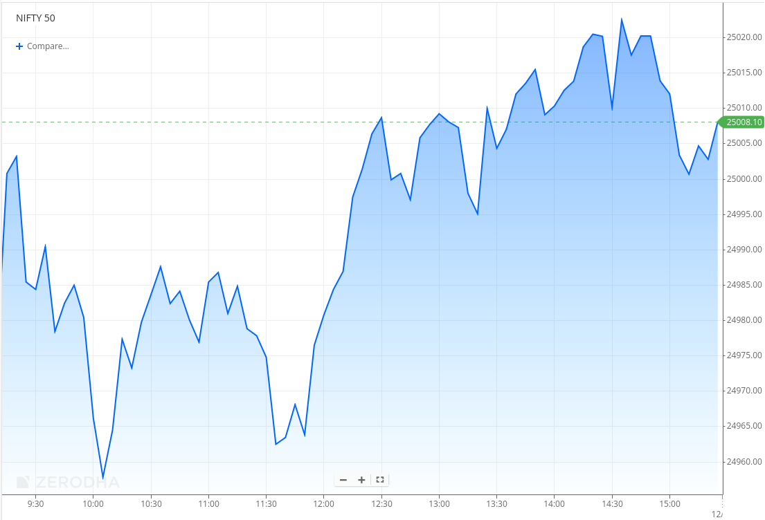 By mid-day, buying interest emerged and Nifty staged a steady recovery, climbing back above 25,000. In the second half, the index extended gains, hitting highs around 25,030 by 2 PM. Despite some volatility in the last hour, it managed to hold above the psychological 25,000 mark and eventually closed at 25,005.50, up slightly from the previous closing levels.