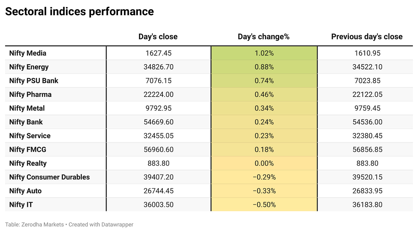 Nifty Media emerged as the top gainer with a 1.02% rise, followed by Energy and PSU Bank indices gaining 0.88% and 0.74% respectively. On the flip side, Nifty IT was the biggest loser, falling 0.50%. Out of the 12 sectoral indices, 8 ended in the green, 3 in the red, and 1 (Realty) remained flat.