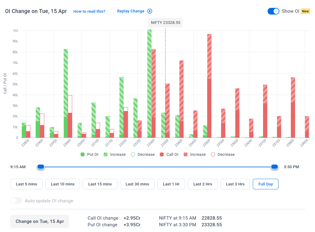 The maximum Put Open Interest (OI) is at 23,300, followed by 23,000, suggesting strong support at 23,200, with additional support at 23,000.