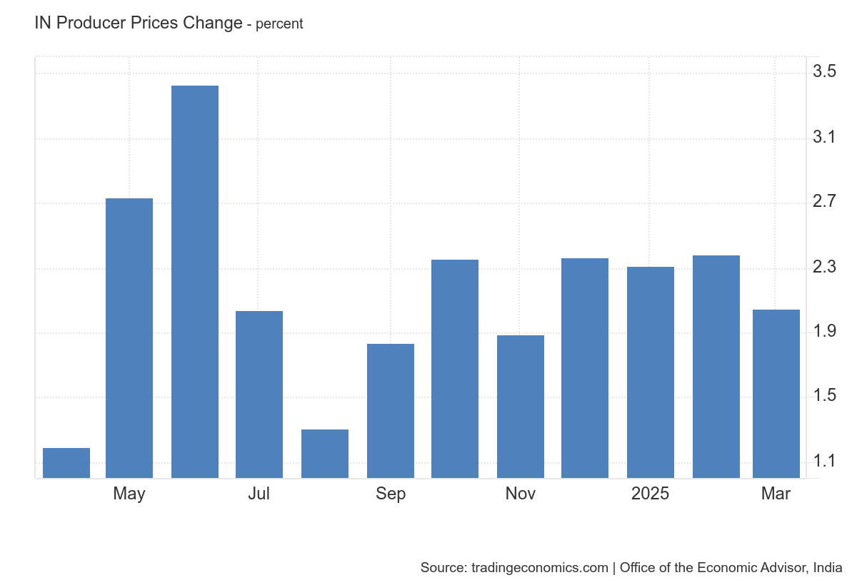 India’s wholesale inflation eased to 2.05% in March 2025, the slowest since November, driven by softer food and primary article prices. Manufacturing inflation hit a 27-month high, while fuel prices rose for the first time since July 2024. Wholesale prices fell 0.19% from February. Dive deeper