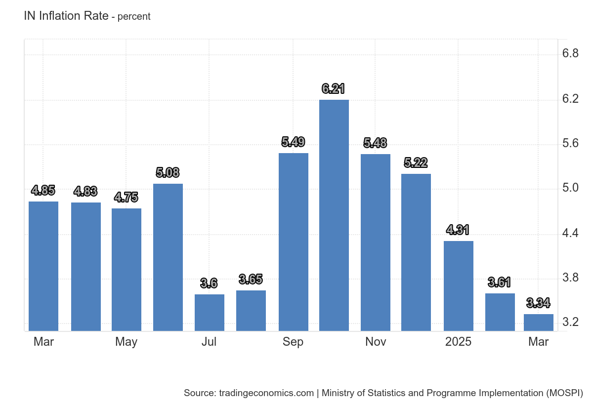 India’s inflation eased to 3.34% in March 2025, the lowest since August 2019, driven by a sharp drop in food prices. The decline offset rising fuel and housing costs, pulling inflation further below the RBI’s 4% target. Consumer prices fell 0.26% from February. Dive deeper
