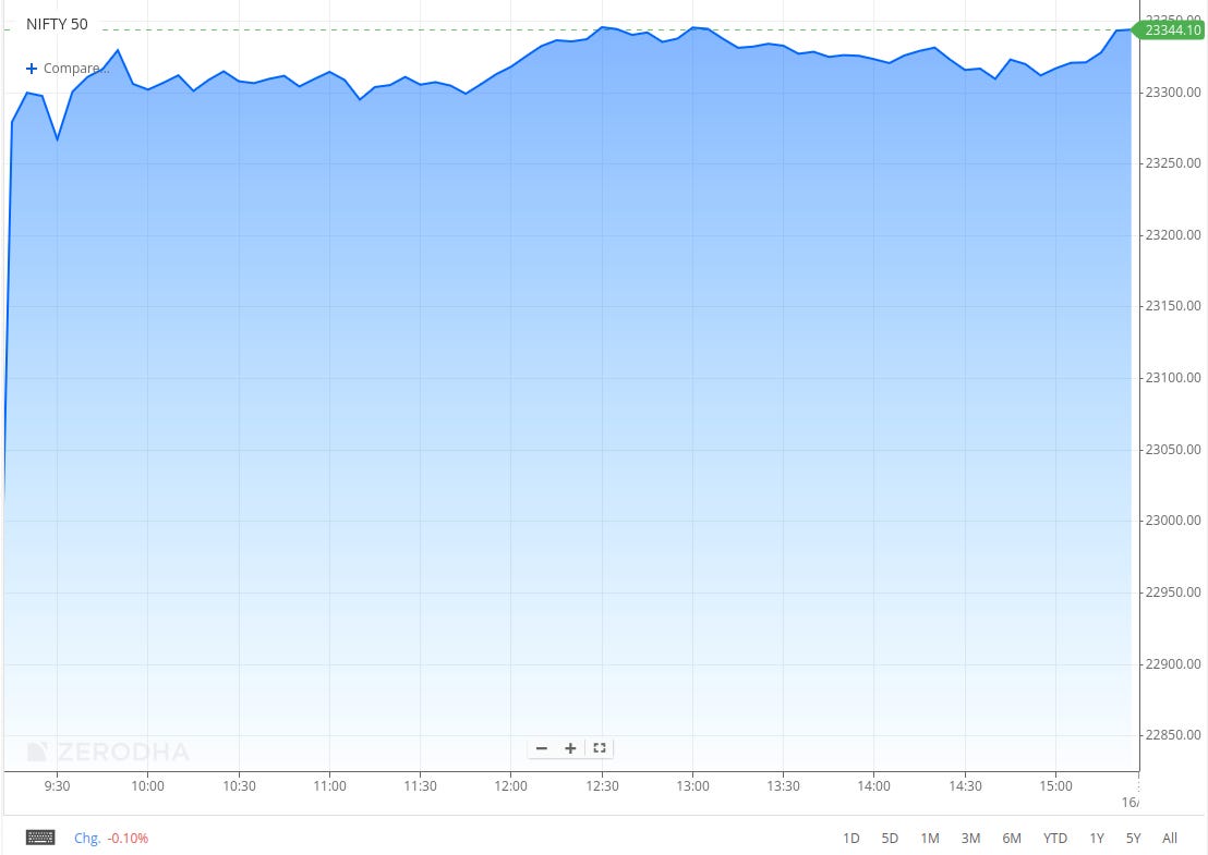 Nifty opened with a strong gap-up of 540 points at 23,368.35, supported by positive global cues after the U.S. temporarily exempted tariffs for certain sectors, easing trade tensions. The index briefly dipped in the initial minutes, touching the day’s low of 23,207 before recovering. It soon moved back above 23,300 and remained within a tight 50-point range between 23,300 and 23,350 through the session. The index eventually closed at 23,328.55, gaining 2.19% for the day.