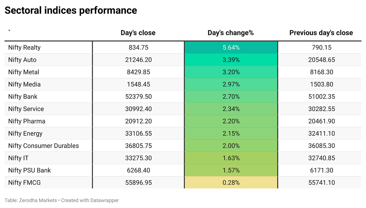 Nifty Realty emerged as the top gainer, rising 5.64%, while Nifty FMCG was the least performing sector, gaining just 0.28%. All 12 sectoral indices ended in the green, with none closing in the red, indicating broad-based market participation and positive sentiment across sectors.