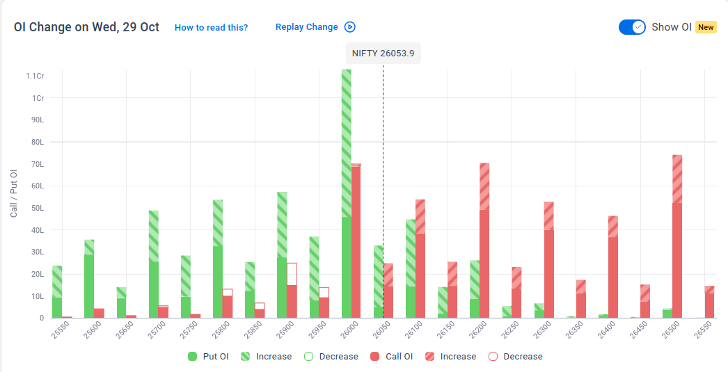 The maximum Put Open Interest (OI) is observed at 26,000, followed by 25,900, suggesting support at the 26,000 to 25,900 levels.