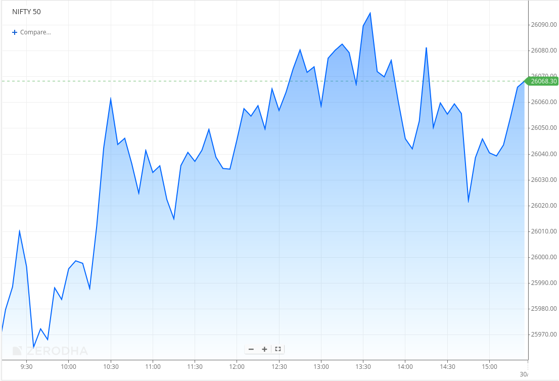 Nifty opened with a 46-point gap-up at 25,982, extending gains from the previous session amid firm global cues. The index quickly reclaimed the 26,000 mark within the opening hour and stayed in positive territory despite intermittent dips. By the afternoon, Nifty regained momentum, climbing to an intraday high of 26,097 before encountering mild resistance at higher levels.